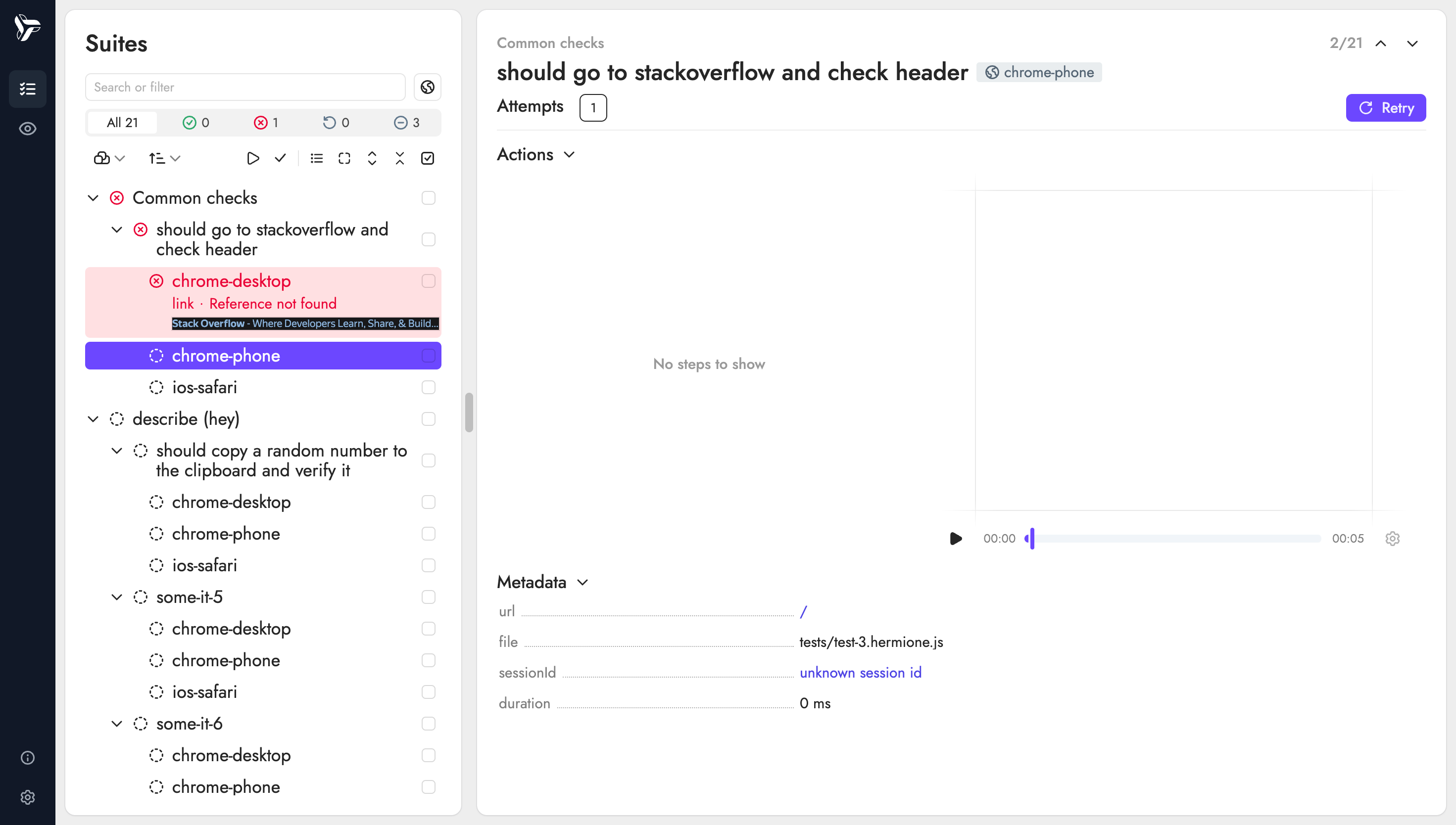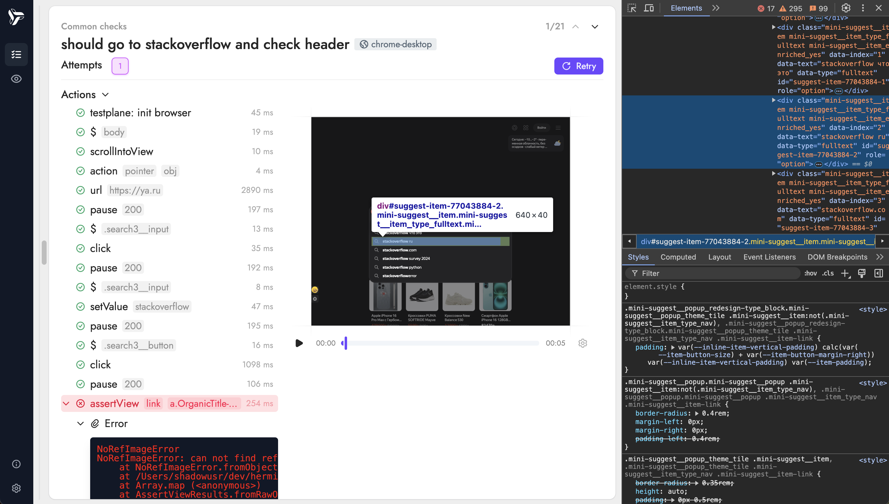 По завершении прогона теста можно воспроизвести снятые снапшоты и перемещаться во времени. При наведении на конкретный шаг плеер покажет состояние браузера на момент его выполнения.