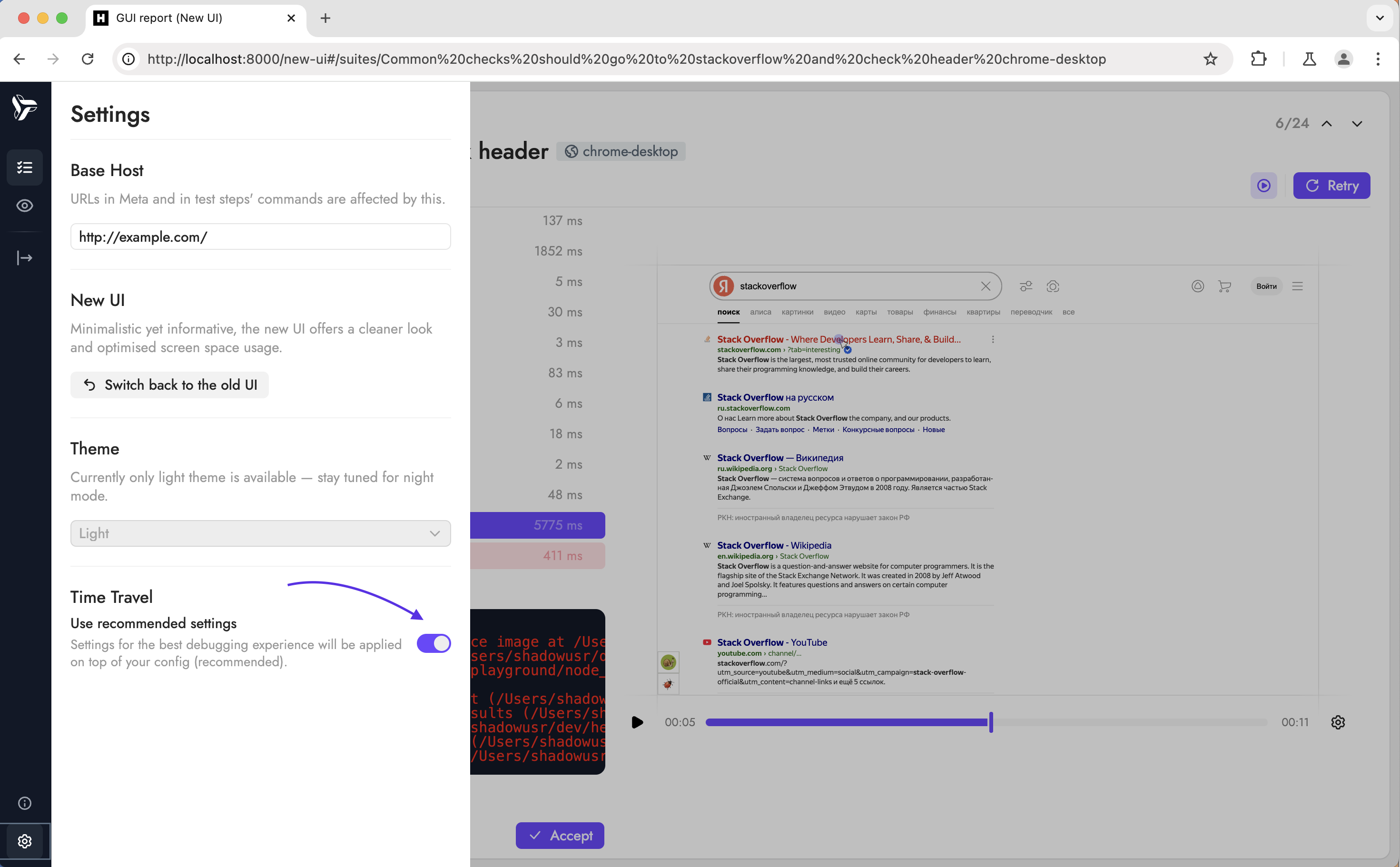После активации Time Travel во всех поддерживаемых браузерах перед запуском будет отображаться окно плеера. Во время прогона теста в него будет стримиться происходящее в браузере.