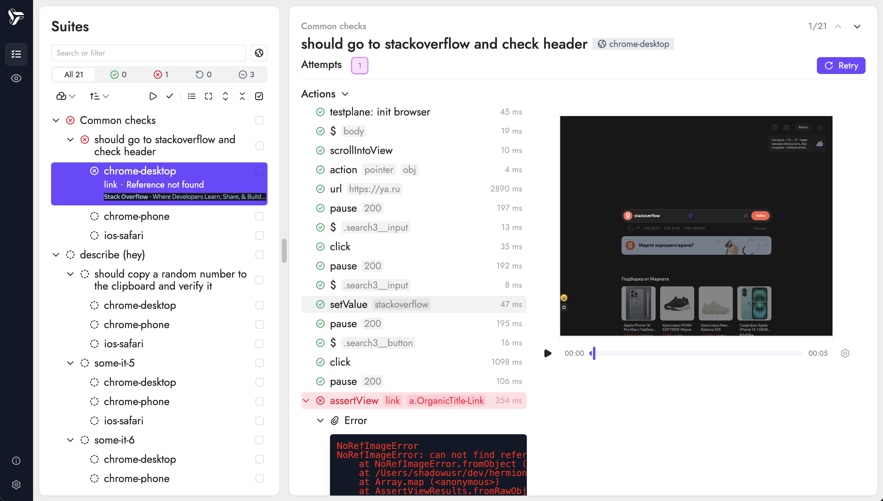 По завершении прогона теста можно воспроизвести снятые снапшоты и перемещаться во времени. При наведении на конкретный шаг плеер покажет состояние браузера на момент его выполнения.